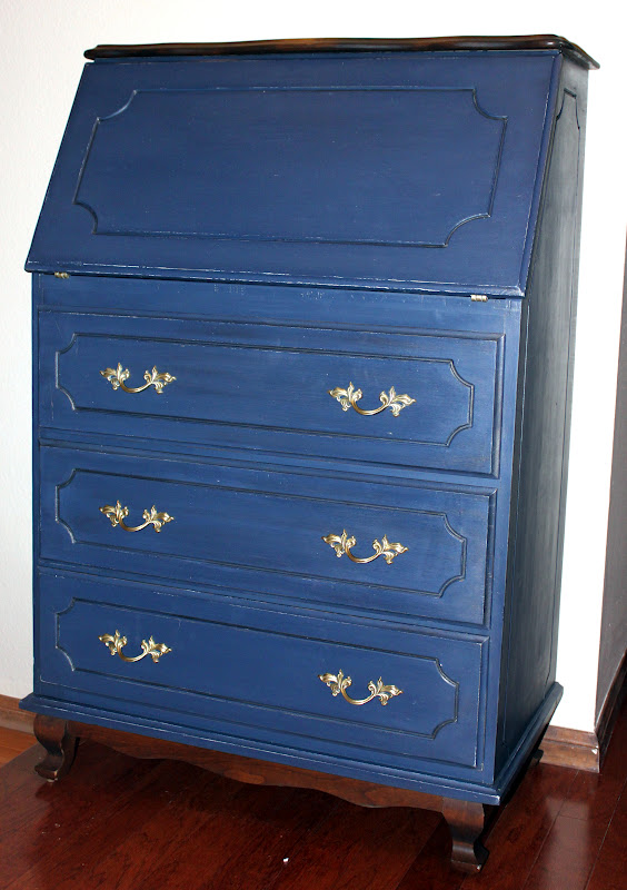 I stained the top, inside, and bottom a dark walnut and then painted everything else a midnight blue. I really like the way she turned out.